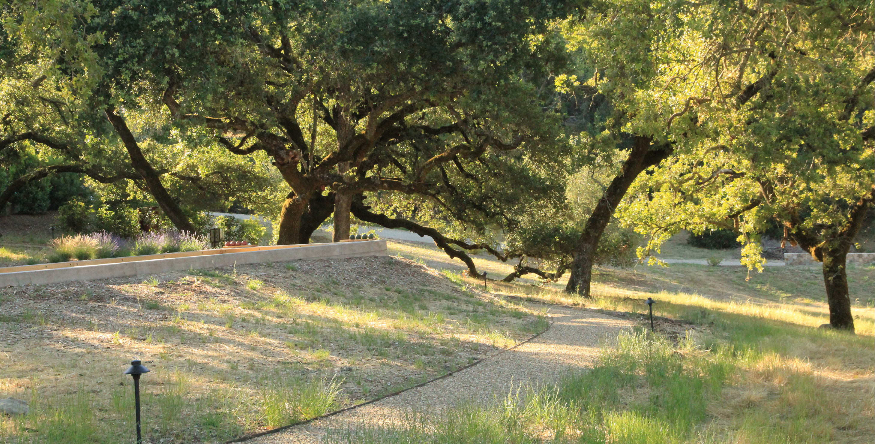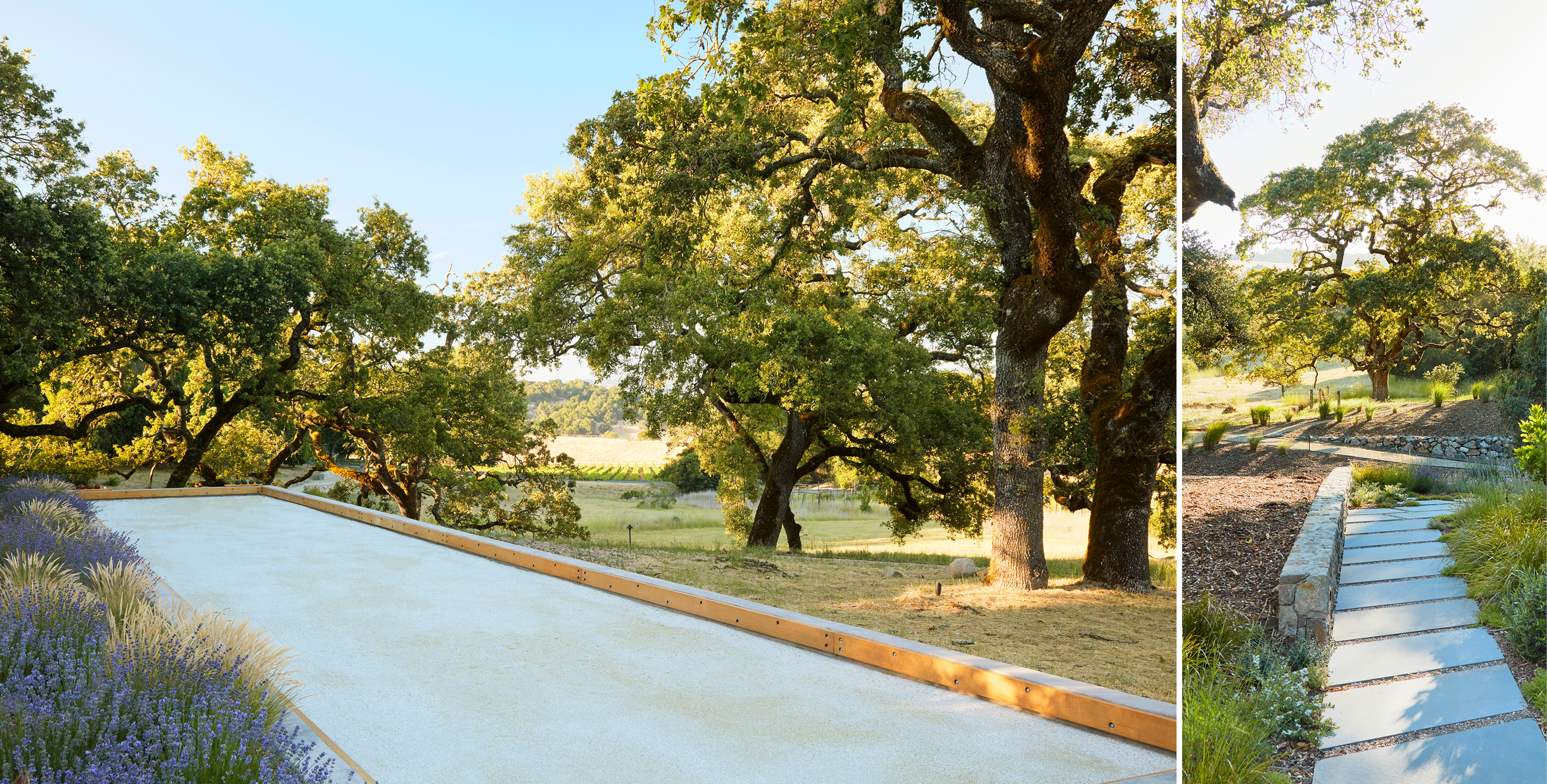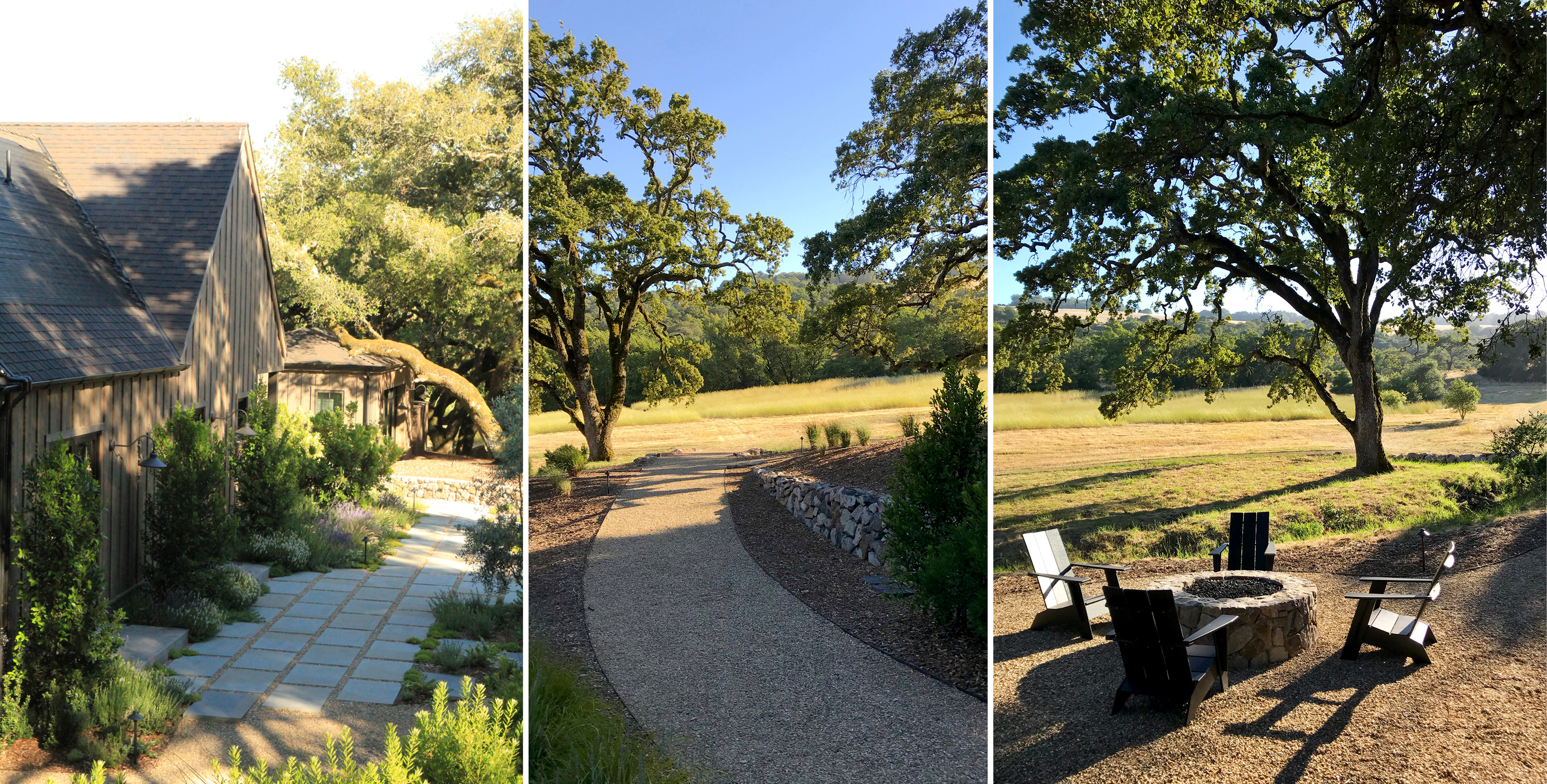 An award-winning project nestled amongst ancient oak trees and open meadows, this residence called for native plantings throughout the property. A variety of stone materials blends into the colors of the surrounding landscape, softening the boundaries between the built and natural worlds.