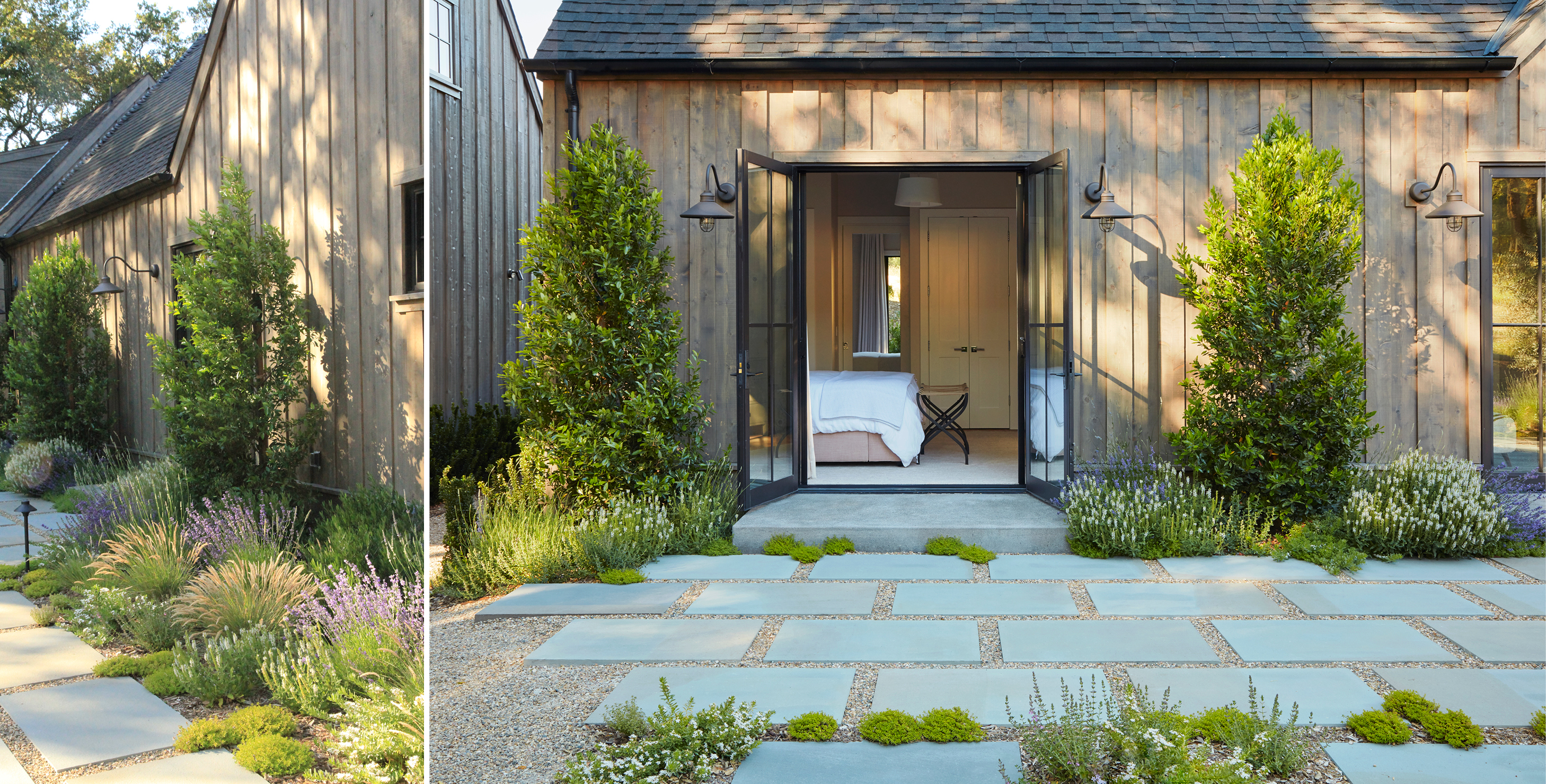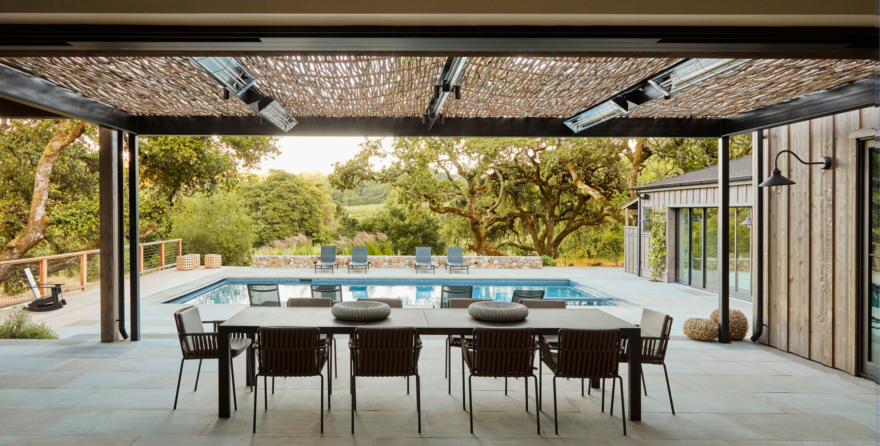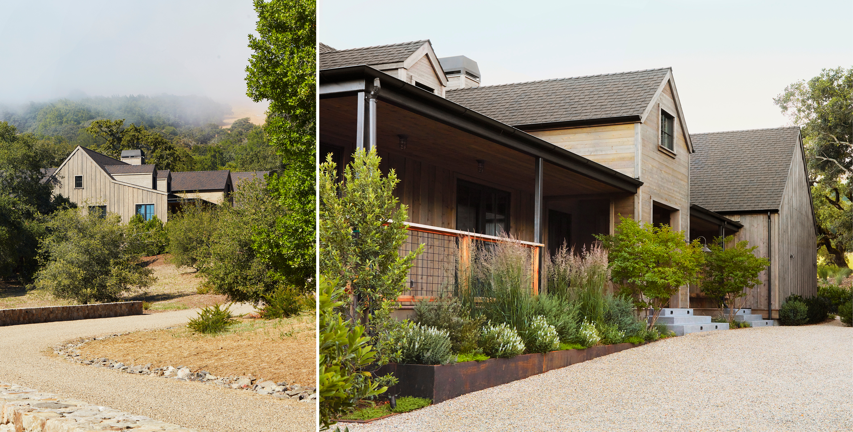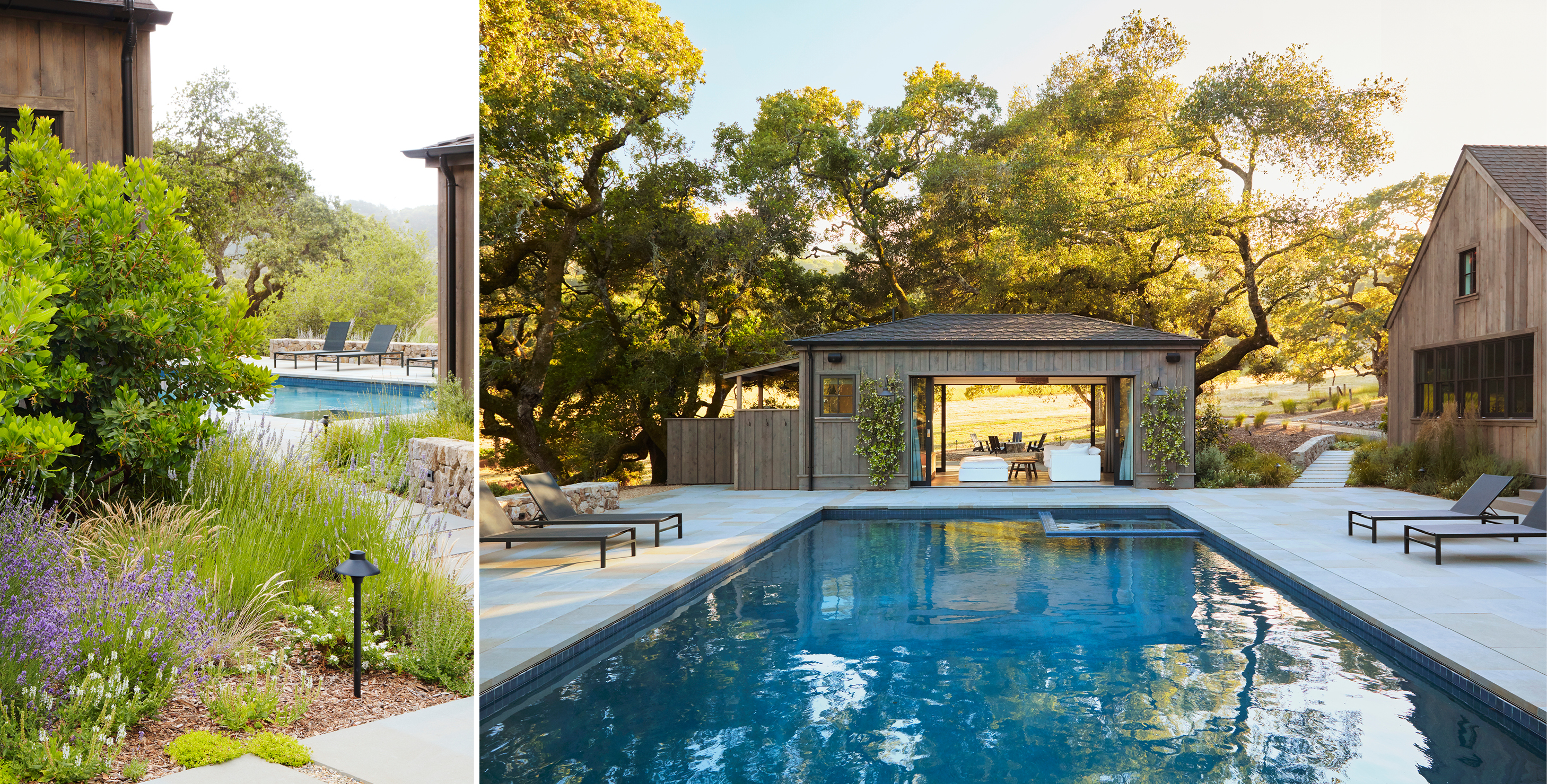 An award-winning project nestled amongst ancient oak trees and open meadows, this residence called for native plantings throughout the property. A variety of stone materials blends into the colors of the surrounding landscape, softening the boundaries between the built and natural worlds.