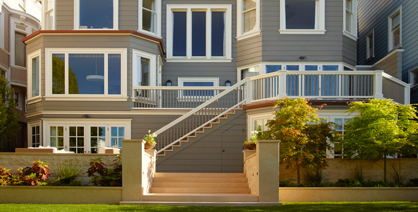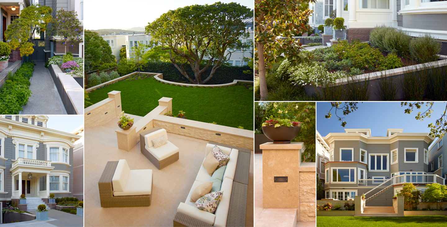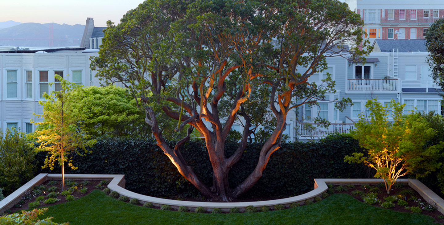 A smooth textured limestone patio spills out onto the lawn of this picturesque Pacific Heights courtyard with a view. The regal strawberry tree crowning the spacious North facing double lot becomes a gracious focal point for every celebration.