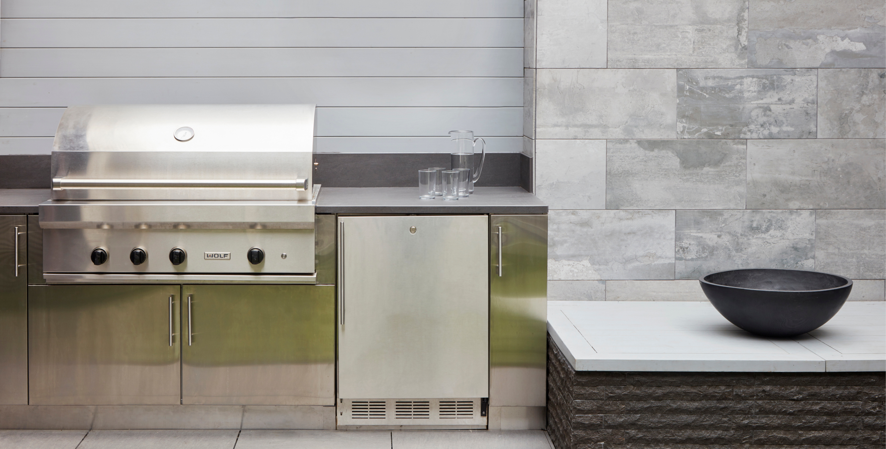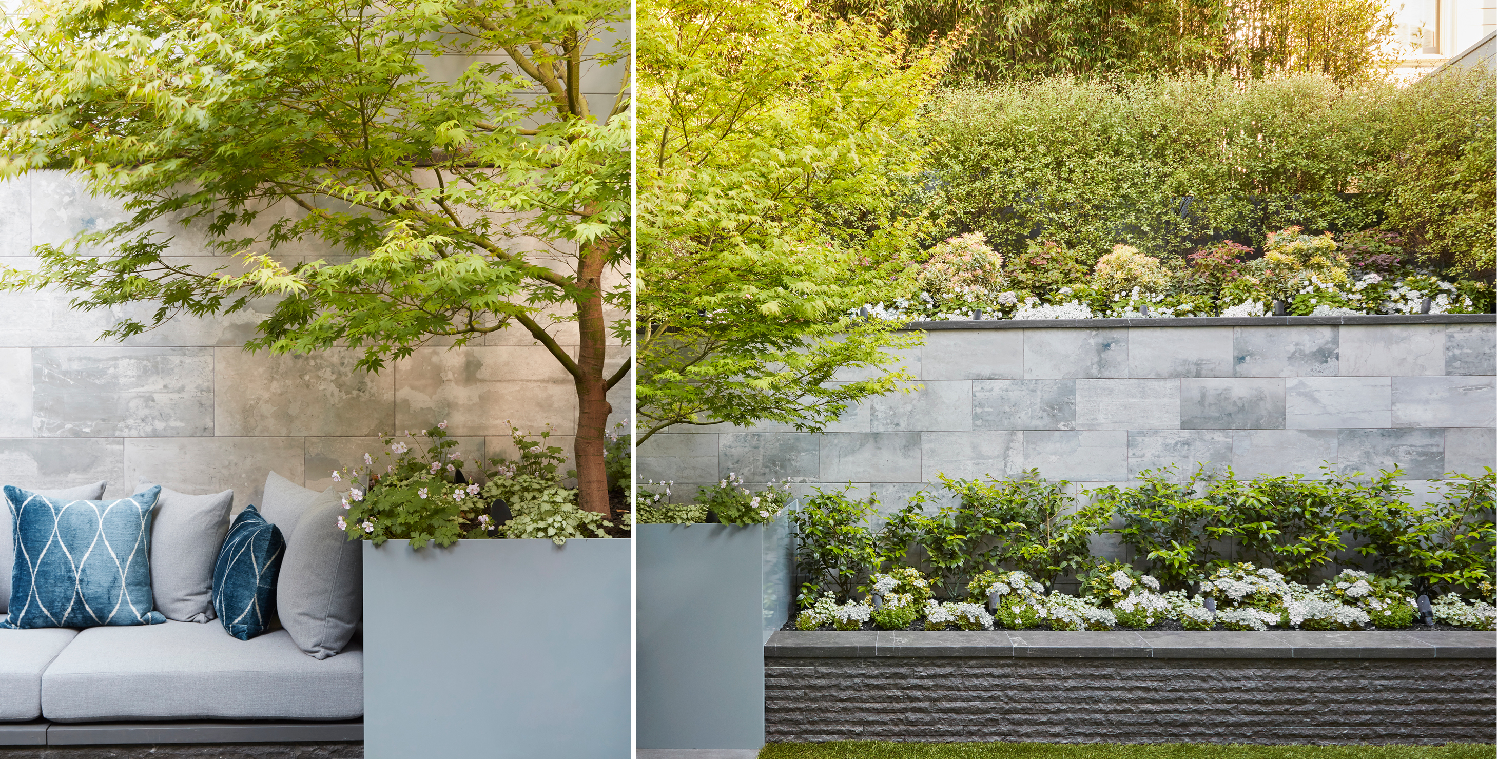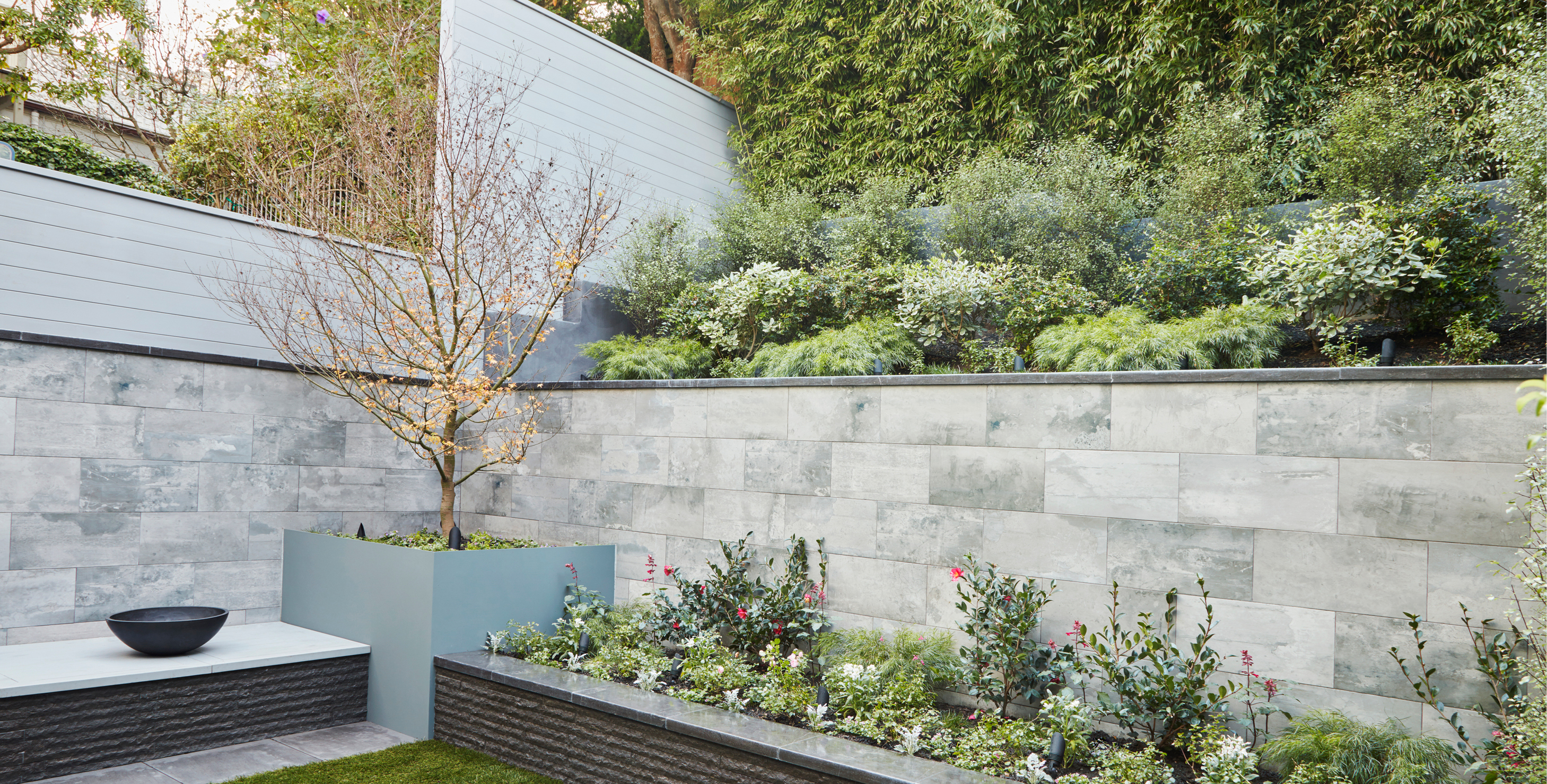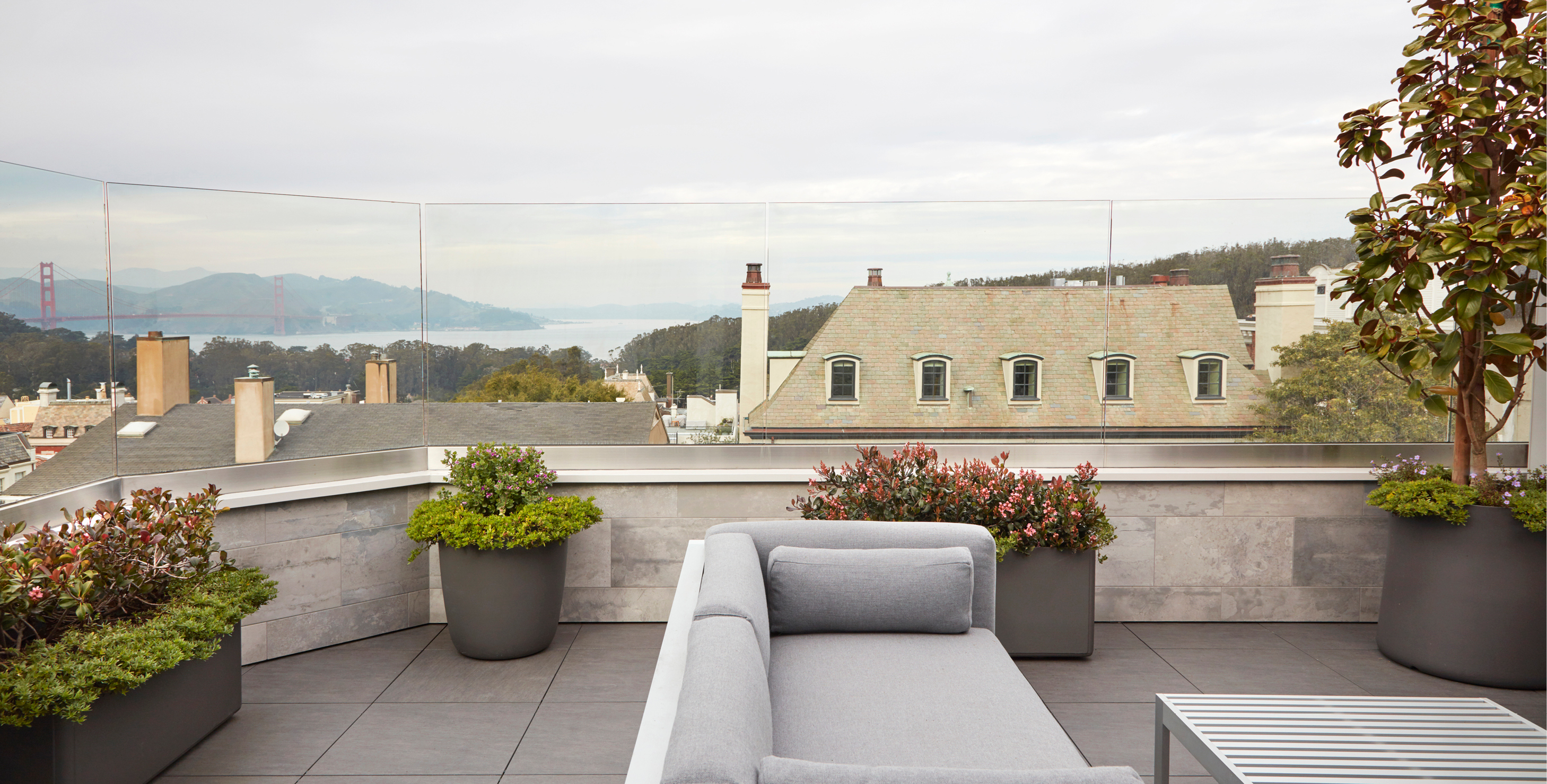 A private terraced garden in San Francisco works with the existing topography to create a beautiful backdrop for family living and lounging. One would never know that the entire rear yard is built over an existing structure. The peaceful garden combines dark-hued textural basalt with smooth porcelain tile in hues of light gray and white. A Japanese maple anchors the corner within a powder-coated metal planter. Expansive views of the city and Bay ground the garden firmly in place.